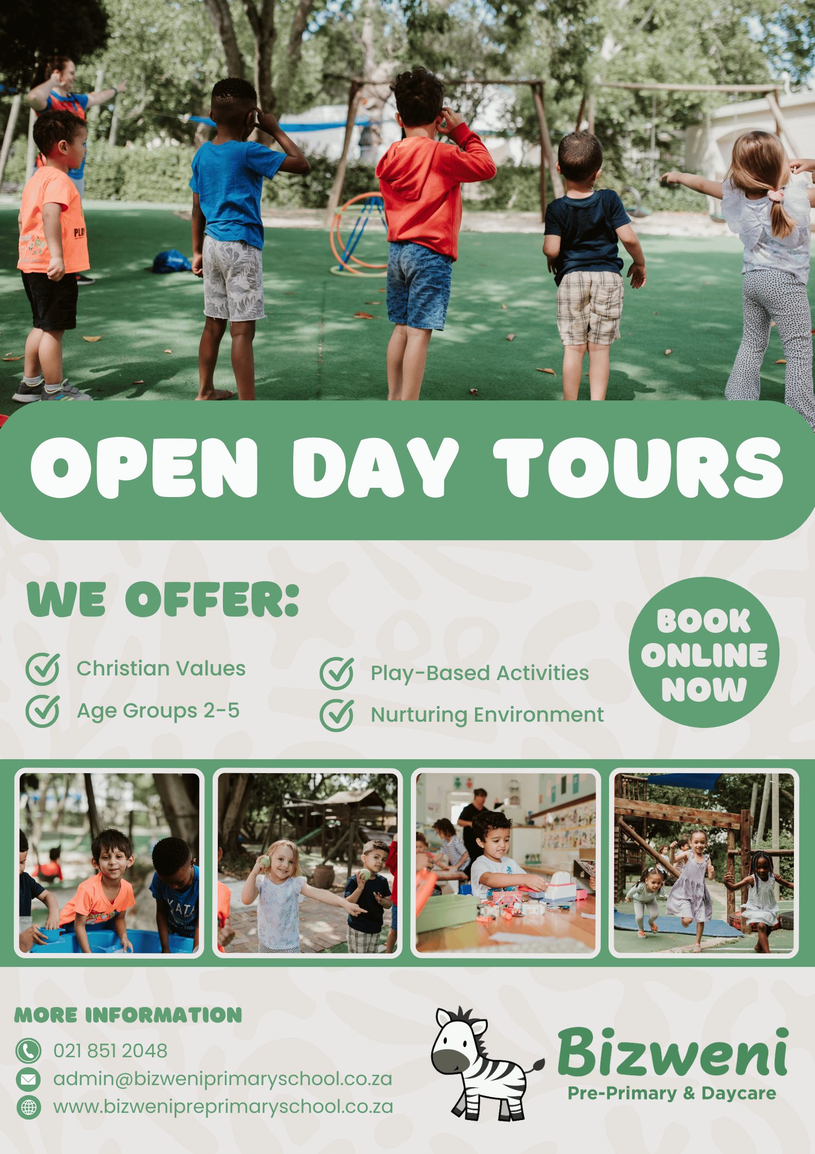 We’re excited to welcome you to Bizweni Pre-Primary School, located on the beautiful Bizweni Campus in Somerset West. Our Open Days are a wonderful opportunity for you to explore our school, meet our team, and experience first-hand what makes our learning environment so special.